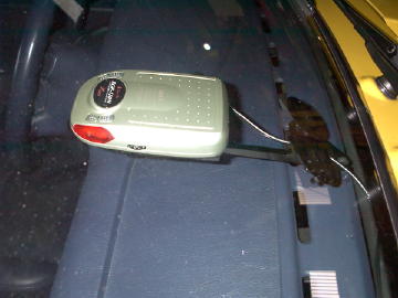 | ダッシュボードにL型金属ステーを取り付けレシーバーを強力粘着テープで固定した。 | アンテナの延長コード&スタンドをRSコンソールBOXまで伸ばし、L型樹脂ステーにアンテナを強力粘着テープで固定した。 |