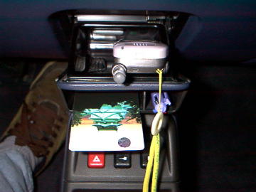 | カーロケ機能付きマルチバンドレシーバー取り付け位置変更 マルチバンドレシーバーを灰皿に入れていたが操作性が悪く、スピーカーが聞こえにくい為、ダッシュボード前面に移動した。さらにアンテナの延長コード+アンテナスタンドをサイドブレーキ後のコンソールBOX位置まで移動させた。これで操作性が上がりカーロケ機能と無線が受信できるようになりました。 |