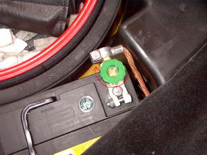 | アメリカ製のバッテリーキルスイッチで簡易セキュリティ機能も備えてます。税込みで¥2730円 | どこがセキュリティか?というと乗らない時にはキルSWをOFFにして時計やオーディオ類の微弱電流だけは下記画像のヒューズ付ジャンパーコードに流す。ポルシェアラーム付でも機能するはず。不審者がセルをONにした場合に大電流でヒューズが飛びエンジンがかからない仕組みになってる。 |