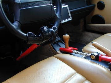 <番外編> 964C2カブリオレの、とのさんよりセキュリティロックの画像を投稿していただきました。セキュリティロックがアクセサリーの部類になるのか判らないですが、どうぞ参考にして下さい。とのさんのコメントです。今回は掲示板に書きました、うちのアマグリの盗難予防状態の公開です(^_-)シフトとサイドブレーキ、ステアリングとブレーキペダル、ステアリングとダッシュ下の三通りの固定をしています。本当はステアリングとブレーキペダルはオルガン式の場合、固定しにくいのですが。。。これならかなりガッチリしてますね。これを壊して盗んでいく盗人は根性が入ってますよね。(笑) |