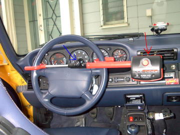 最近は車両盗難が激増してますからハンドルロック式の盗難防止機を購入しました。メーカーはレーダー探知機とかで有名なサンヨーテクニカのCS-01です。この製品の特徴は感度調整式のアラーム(画像の赤矢印)が付いており振動が伝われば110dBのアラームがけたたましく鳴ります。一番敏感な感度にすると窓ガラスをコツン!と叩くだけでアラームが鳴り響きます。(アラーム設定と解除は暗証番号で入力) 画像青矢印の鍵はピッキングに強い特殊十字キーを採用。価格もインターネットで買えば¥10000ほどでリーズナブルです。これで100%安心ではありませんが現在930、964、993のポルシェアラームだけに頼っていてはもはやドロボーの餌食になるのは時間の問題。安い投資だと思います。 |