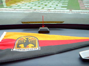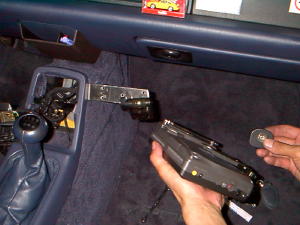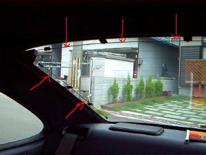 | 固定されたL字ステーにナビ本体を固定します。もちろんポータブルですので取り外しは簡単です。 | これが取りつけた画像です。 | 次ぎにアンテナ類の配線です。FM多重用アンテナをリアウインドウにL字型に粘着テープで固定しました。 |