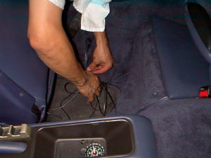 | GPSアンテナはダッシュボードに置くのはやめてリアウインドウ下のスペースに固定。OP販売の長い5mコードの方を使用した。 | FM多重用アンテナとGPSアンテナの配線は見えないように助手席まで引っ張り込み本体と接続。 | 電源はシガーライターから引きSWをON !画面が出てくるのを確認して作業は終わり。後は実際に走行して不具合がないか?確認。 |