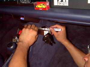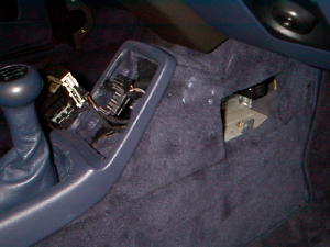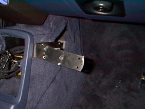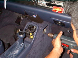 | L字ステーを裏からナットで止めるためにシフトレバー前のSWパネルと足元のパネルボード蓋を外した。 | パネルボードにマーキングした箇所にドリルで孔をあける。 | L字ステーをボルト&ナットでしっかりパネルに固定。 |