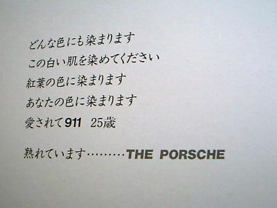 <永遠のバイブル>2001年10月に小生がある方からいただいたメールに感涙したエピソードです。CG誌がかってミツワ時代の時に大阪のSモータースさんがポルシェと風景を映した綺麗なワンショットPHOTOとポエムを毎月広告として出されたことを御存知でしょうか?実は911予備軍のころにそのPHOTOを見て小生はポルシェの美しさに桃色吐息を出しながら、うっとりとしてました。撮影されたのはSモータースさんの取締役のOさんであります。(Oさんと言えば356B時代から現行ポルシェに関わってこられた超ポルシェ・エンスーであります)Oさんが全国を旅して撮影されたこの傑作PHOTOには感動してましたのでMY HPで自分の911カレラもなんとか、あのような美しい画像をお手本に撮りたいと願ってました。実はそのOさんからメールをいただき小生のHPを興味をもって見ていただいたそうです。そしてお礼を書いた後に、なんとあの傑作ワンショットPHOTOを集大成した御自身の写真集を送付して下さったのです。CG誌に20年余り掲載されきました抜粋上梓した「方向オンチが馳った道」です。奥深いポルシェについてはまだまだ何も知らない、若造の小生に進呈して下さったお気持に感涙してしまいました。この写真集は忘れえぬ一生の宝になると思います。サロンの皆様にお会いする機会があればこの写真集をお見せできると思います。とにかく素晴らしい!!見るアロマセラピーの世界で気持がうっとり...です。そしてポエムが泣けてきます..... (^^) |