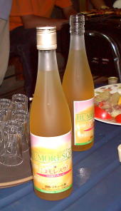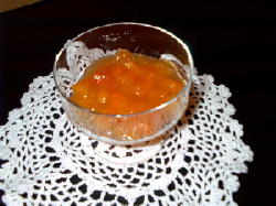 <シロガネさん解説> 中身をご報告いたしますと、リプトンのリモーネという紅茶(?)がありますね。レモンの絵が書いてあるやつです。あれと、その姉妹品の桃の絵が書いてあるやつを使いまして、リキュールは、ヘビーなラムと、泡盛と、三年みりんです。甘味は、グラニュー糖を使いました。全体量としましては、ゼリーが2リットル強と小ぶりの柿が、40から50個くらいです。で、リキュールは、お砂糖が溶けたあと、火を消す直前に入れ、アルコールをあまり飛ばさないようにいたしました。温度的には、70度を超えていないと思います。その状態でゼラチンを溶いて、すぐに流水で荒熱を取り、お鍋を直ちに氷水に浮かべてかき回しながらゼラチンを固めにかかります。おなべの中が、トロンとしてきましたら、そこで柿を入れてさらにそっと混ぜ合わせて、ウニャラカ状態になると壜に詰めて冷蔵庫で3日くらい寝かせます。この間、酵素君が、働いているわけなのですね。勉強になりました。なお使用いたしました柿は、庄内柿という、安物の平種無し柿であります。お酒が美味しい季節、これからも、こいつがあれば、二日酔いせずに呑めるかなと、飽きずに喰っております。 |