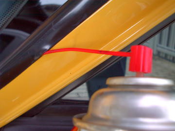 走行中にビリビリ!と、きしむ音がする場合はほとんどがフロントガラスかリアガラスが多いようです。MY993も運転席側のフロントガラスよりキシミ音が大きくなったので噂のCRC注入を試してみたところ、一発で治りました。本来は接着剤を充填するのが正当な対策でしょうが、このCRCでの応急処置もけっこう効果があります。しかも簡単で誰でも作業ができます。画像のようにCRCスプレー缶のノズルを外側のパッキン内に挿入して注入してみました。このCRCでの方法だと雨や洗車で流れてしまいますのでまたキシミ音は時間が経過すれば発生するでしょう。あくまでこんな応急処置も可能であるということで紹介してみました。 |