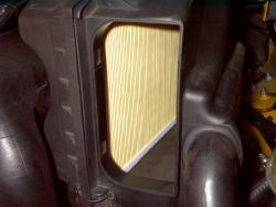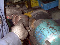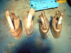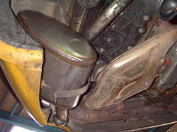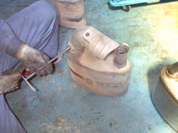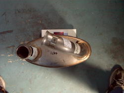 | 17.右スポーツマフラーを取りつけます。 | 18.テールパイプが錆びてますのでグラインダーできれいに磨いてもらいました。 | 19.左右のテールパイプを装着します。 | 20.せっかくプラグ交換とSPマフラーにしたのですからエアーフィルターも新品に交換しました。良い吸気、抜けのいい排気、強い点火を良くすれば気持ちよく回るはずです。 |