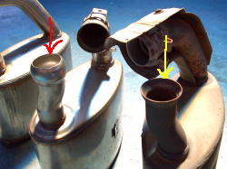 | 9.遮閉板とクラッチダストエアーパイプを外し3本のプラグを交換。赤丸部分は一番外しにくいプラグ位置でパワステポンプが邪魔をして右上からは外せない。 | 10.スポーツマフラーの重量をヘルスメーターで測ってみました。1個7.0kgです。ちなみにノーマルも7.0kgで同じでした。 | 11.左がノーマルマフラーで、熱遮閉板が付いてます。 | 12.赤矢印がスポーツマフラーのフランジ形状。黄矢印がノーマルマフラーの形状。スポーツマフラーのフランジ形状の方がテールエンドパイプの位置決めがやりやすい形状になってる。 |