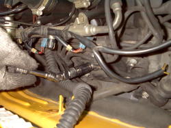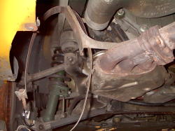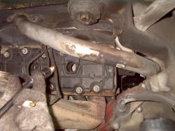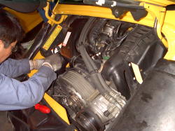 | 5.左のノーマルマフラーを取り外します。 | 6.左下のスパークプラグ3本を交換します。 | 7.右下のスパークプラグ3本を交換します。 | 8.さらに右上のプラグを交換するために遮閉板(赤矢印)とクラッチダストエアーパイプ(黄矢印)を外します。 |