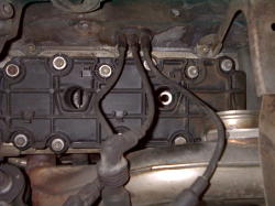 | 1.赤線のエアーフィルターBOX、ファンなど補機類を外します。 | 2.左上のスパークプラグ3本をまず交換します。 | 3.左右マフラーのテールエンドパイプを外す。 | 4.右のノーマルマフラーを取り外します。 |