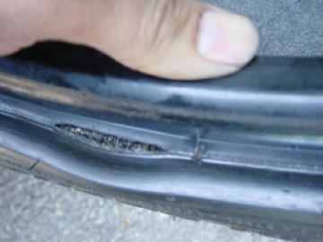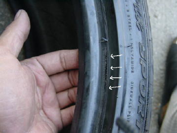 993カレラ4Sに乗る一徹さんの18インチ・リアタイヤに亀裂が入っており、その画像を投稿いただきました。911についてはリアタイヤにかなり負荷がかかるのでよくバーストしなかったもんです。亀裂は左画像の白矢印の箇所ですがタイヤのラインに沿ってますので見落としやすいですね。皆さんもタイヤは空気圧チェックだけではなく傷や亀裂がないかよく調べてくださいね。