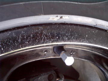 2003年9月に鈴鹿サーキットフルコース走行会に参加しました。その時にスピンしてグラベルで砂遊びした時に砂と小石でホイール黒塗装とキャリパーに小傷が入りました。サーキット走行ではこのぐらいのことは覚悟してましたが特に黒塗装ホイールの場合は小さなスプラッシュ傷が目立ちやすくなんとかならぬものかと考えたのが今回の方法です。(ホイールの再塗装は高価であり眼中になし。笑) 車のボディーの小傷を目立たなくする色素顔料(黒)を含んだ「傷消しカラーワックス」という真っ黒のワックスで磨いてみました。これが白く目立つ傷を隠してくれ見た目に耐えられるレベルまでになりました。(^^) ボディと同色のカラーホイール塗装をされてる方も試してみてください。 「傷消しカラーワックス」はカーショップで¥819円(税込)ですから安くていいですね。