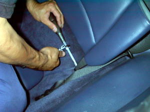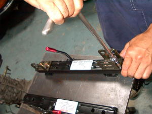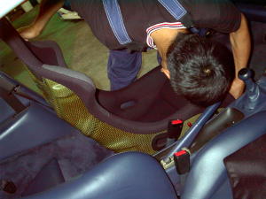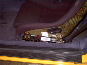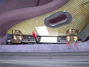 | ドア側のレールを仮固定します。 | さていよいよバケットシートの仮固定です。 | バケットのサイド部分に左右前後4箇所にネジ孔がありレールの金具とボルトで固定します。 | ||||||||
