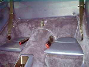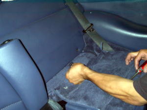 | 純正シートを外したついでにリアシートの背もたれも左右2個外しました。固定してるボルトはかなり固く締め付けられてます。 | 背もたれのカーペット部分も外します。背もたれの重量は1個2kgで2個で4kgの軽量化になりました。 | 背もたれを外したリアシート画像です。広く感じますね。 | ||||||||