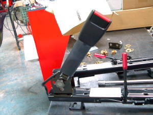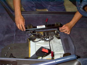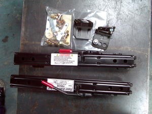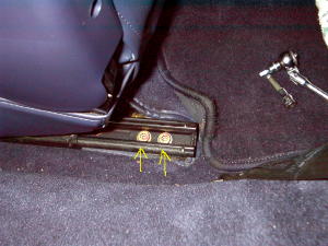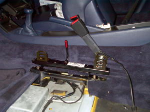 | 左右のダウンレールに付属の金具を取り付けます。 | サイドブレーキ側のレールにシートベルトのバックルも取りつけます。 | サイドブレーキ側のレールを仮固定します。 | ||||||||