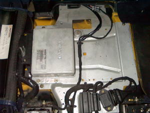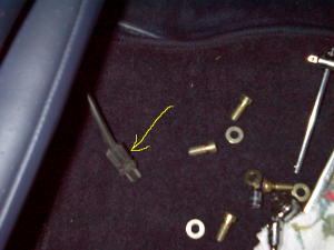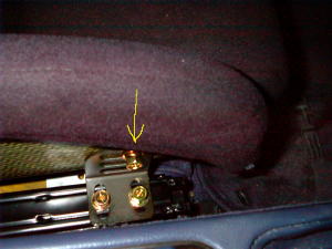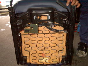 | 黄矢印のシートベルト警告モニターの線をちぎらないようにソケットから抜きます。 | 純正シートの下は画像のようになってます。ボッシュのコンピュ―ターユニットがあります。 | 純正シートの裏はこうなってます。レール付重量は22.5kgとかなり重いです。 | ||||||||