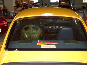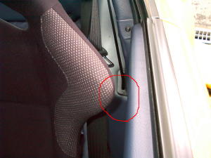 | 取りつけ完了後です。(^^) シートベルトは当面ノーマルを使います。いずれは4点式か。 | リアから見たバケットです。黄金色をしてますのでよく目立ちますね。目立屋さんにはいいかも。笑 | バケットシートのショルダー部分とドアのクリアランスはこんなもんです。純正シートベルトはやや使いづらいのはしかたないですね。 | ||||||||