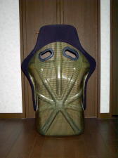 | 前オーナー様がレカロSP-Aのシート生地にPORSCHEクレスト刺繍をワンポイントで付けられてました。(^^) | サイドから見たSP-A | 背面から見た画像です。カーボンとケプラーの組み合せで作られていますので黄金色に見えます。背面に入った9本のビード成形が強度と迫力を増しますね。 | ||||||||