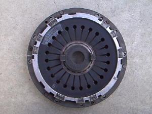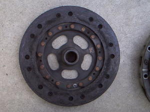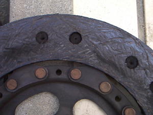 | 1999年6月にクラッチのオーバーホールを実施した。下の画像は45400kmを走行したクラッチ・パーツの画像である。 右画像のディスク面の拡大画像を見ていただきたい。表面の磨耗がディスクのリベット部分まで磨り減っているのが判るでしょうか。まだリベットまで掛かってないのであと1000kmぐらいは走行可能な状態であったようだ。OHの目安としては、クラッチミート・ポイントが新品ディスクと比較すると深くなってくる。またペダル遊びのスプリングバックが弱くなってくる。40000kmを超えた距離よりペダルを踏んだ時に床下より、キリキリとキシミ音がしてきた。これはショツプで診断してもらった結果、クラッチのリンケージ部のグリス切れが原因とのこと。これらの判断によりオーバーホールを実施した。ダブルマス・フライホイールはまだ充分に使用可能であり、この時には交換していない。小生の911は35800kmで購入したので前オーナーがどのような使い方をして、どんなクラッチワークをしたかは不明である。したがって、小生のフル・クラッチワークでどのくらいまでディスク寿命があるかは、次回OH時に報告する。 | ||