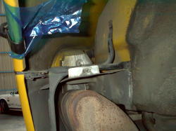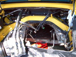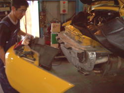 | バッテリーの配線とエンジンルーム内の電装とウインカー類を外す。リフトアップしてアンダーカバー類も外す。 | まずRバンパーを外すためにRタイヤハウス内、その他の固定部分を外していく。 | Rバンパーが外れました。 | Rバンパーの骨格部分を外していきます。 |