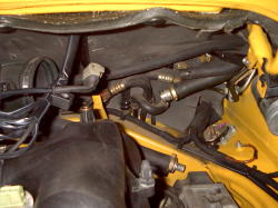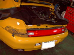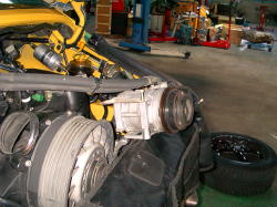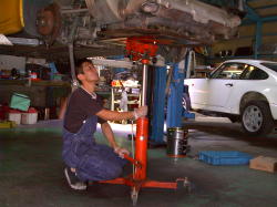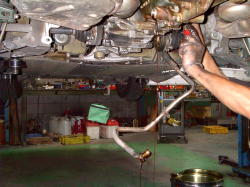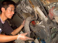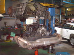 | エンジン本体とオイルライン内のオイルを抜きます。 | エンジンルーム内の各種ホース、パイプ類を外す。 | エアコンのコンプレッサーも切り離します。 | さてリフターを準備してエンジンを降ろす準備をします。エンジンマウントの固定を外しいざエンジン降ろしに入ります。 |