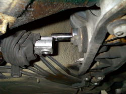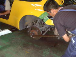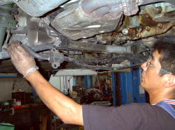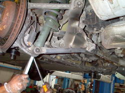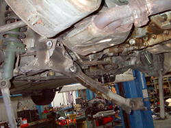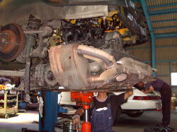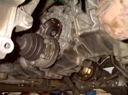 | ドライブシャフトのナットを緩めておく。運転席でブレーキを踏んでおかないといけません。 | マルチリンクのアーム類やアース類も外されていきます。 | ミッションのリンケージ部分も外します。 | 左右ドライブシャフトの付け根を外す。 |