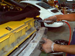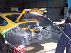 | エンジンは一気に降ろさず細心の注意でゆっくりと降ろされていきます。 | 完全にエンジンは降りました。 | エンジンが降りたらホース類に水分が入らないようにマスキングしてエンジンルームをスチーム洗浄。 | エンジンルームはピカピカ!になりました。 |