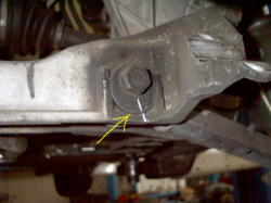 | アンダーカバーを外したらエンジンまわりの補機類関係を次々に外していく。 | Rスタビライザーも外す。 | マルチリンクサスの現在アライメント位置をマーキングしておく。(画像の他にもアリ)これでエンジンを載せた後に概略のアライメントがとれるようにしておく。(正確には4輪アライメントを取り直すのが基本) | 積み木のマルチリンクを外していく。 |